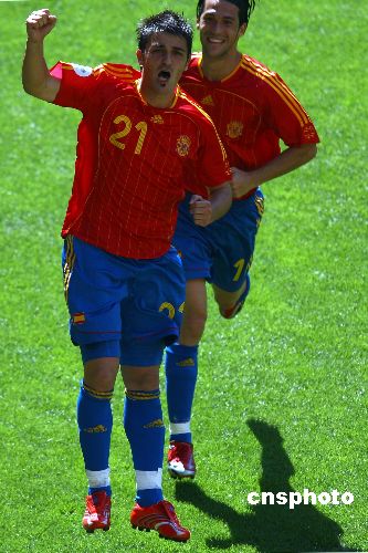德国莱比锡当地时间六月十四日,世界杯H组第1轮首场比赛在莱比锡中央球场展开角逐,西班牙最终4比0大胜乌克兰,创造了本届世界杯至今最悬殊比分。上半时,西班牙抓住两次定位球机会,阿隆索接应哈维角球,顶入他首粒国家队进球;比利亚任意球折射入网。下半时,托雷斯突破导致季莫舒克红牌罚下,比利亚主罚点球梅开二度。终场前,托雷斯锦上添花。中新社发 盛佳鹏 摄