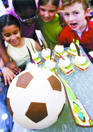 中新网6月15日电 据北京晚报报道,日前,丽都、国际艺苑皇冠、五洲皇冠假日酒店等十家酒店在京举办美食烹饪大赛。诸多顶级厨师、咖啡调配师及调酒师将参加角逐。恰逢世界杯,一个直径24厘米、重4公斤的巧克力和杏仁糖制作的足球独具匠心,还有用酸奶慕斯制成的甜点代表8支参赛队。(阎彤)