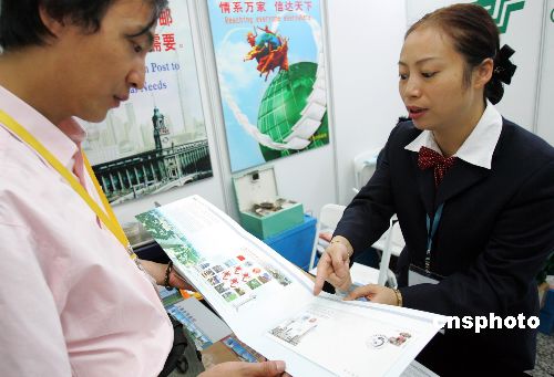 六月十五日,由上海市邮政局制作的上海合作组织成立五周年纪念邮册正式发行,内含六版上海合作组织成员国风光主题个性化邮票。图为一位与会人员正在购买纪念邮册。中新社发 汤彦俊 摄