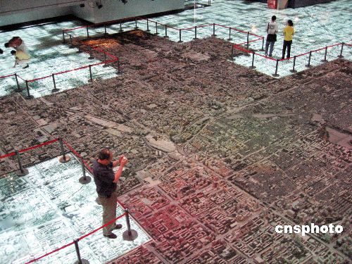 6月16日,一位北京市民在北京规划展览馆内参观北京城市规划模型。该模型面积302平方米,比例1:750,周边满铺同比例正摄影像图灯箱片近1000平方米,用以展示未来北京的现代化风采和历史文化名城的古老风韵。中新社发 杜洋 摄