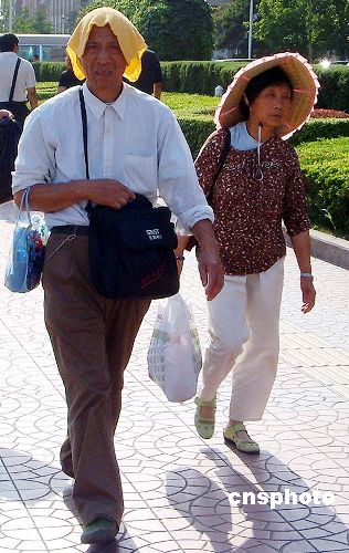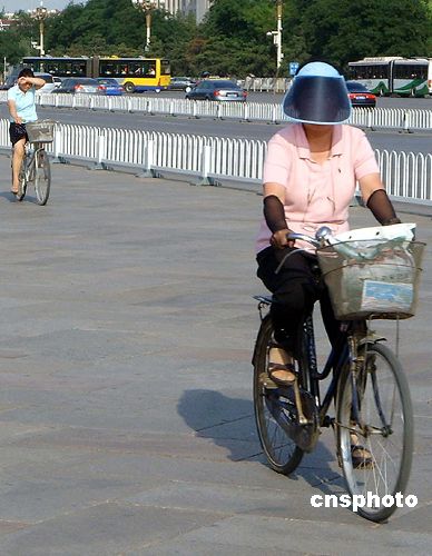 6月15日,北京酷日当头,气温升至35摄氏度,创下2006年京城气温新高,外出的人们,采取各种方式抵御紫外线照射和高温侵袭。中新社发 玉龙 摄