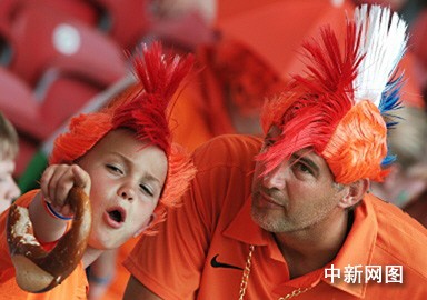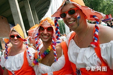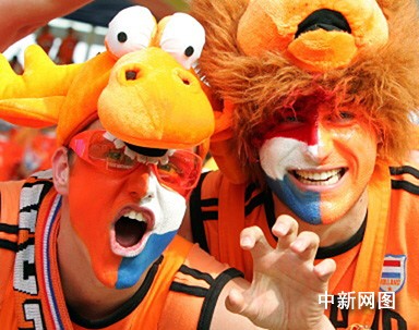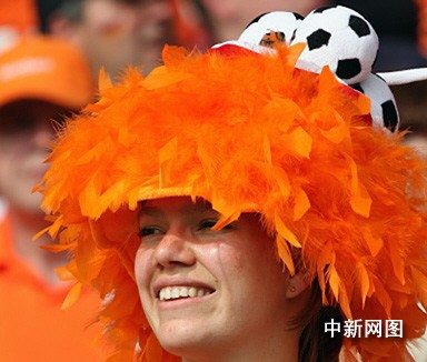 北京时间6月17日凌晨,荷兰队在世界杯C组的一场比赛中2比1击败了科特迪瓦,提前获得小组出线权。赛后,荷兰队员在球场与球迷进行了互动,感谢球迷的支持。图为荷兰球迷的另类造型。