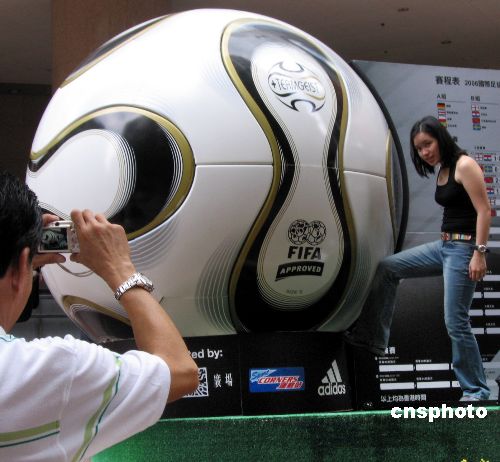 世界杯足球赛期间﹐香港一处广场上的“大足球”成为人们留影的好背景。中新社发 宋吉河 摄