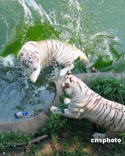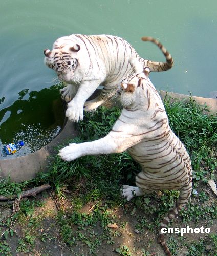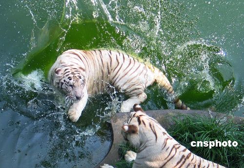 6月18日,在南京市红山森林动物园狮虎园内,两只老虎为争夺纳凉权进行激烈的打斗。当日,据气象部门报告,南京最高温度达到摄氏35度多,在南京市红山森林动物园狮虎园内,两只老虎为了争夺水池旁的纳凉权发生了激烈的打斗,最终,败下阵来的老虎逃离了水池,在争斗中获胜的老虎则独自享受清凉。中新社发 钟山 摄