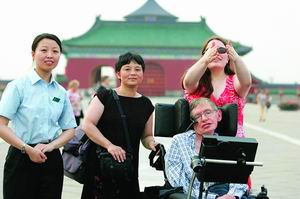 霍金于前天抵京。昨天下午5点,霍金一行来到天坛。他们在天坛首先参观了古代皇帝祭天的圜丘坛,导游吴颖向霍金介绍了圜丘的历史和功能。当讲到圜丘上层以“天心石”为圆心,从外到内分别铺设了扇面形石块,并以九的倍数依次向外延展,栏板、望柱也都用九或九的倍数,象征“天”数以实现皇帝“天人合一”的目的时,霍金表现出很大的兴趣。在讲解完毕后,他主动要求环绕圜丘旋转一周,以感受中国传统的“天人合一”的哲学。