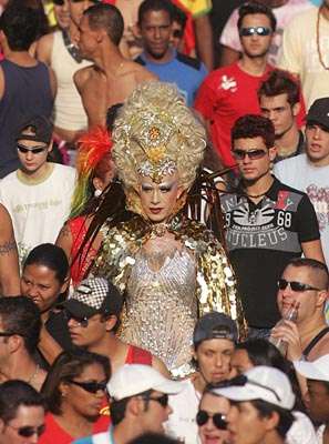 第十届的一年一度圣保罗同性恋骄傲游行又见跳摇摆舞的同性恋者和易装癖者,在播放跳舞音乐的卡车上起舞,穿过圣保罗市的建满摩天大楼的金融心脏地带。