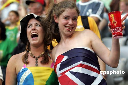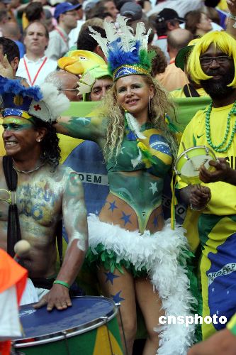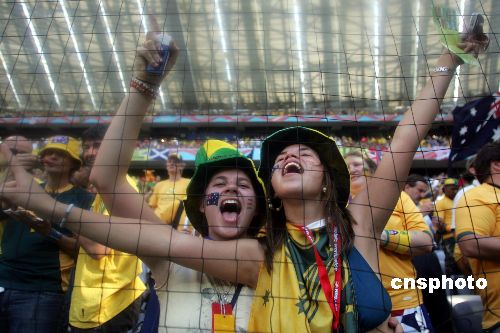 德国慕尼黑当地时间六月十八日,世界杯足球赛进行了F组第二轮的最后一场比赛在慕尼黑世界杯体育场进行,卫冕冠军巴西队在与希丁克率领的澳大利亚队的比赛中抓住了两次机会,以二比零击败对手完成两连胜,提前从该小组中出线。图为在赛场中的女球迷。中新社发 盛佳鹏 摄