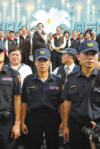中新网6月19日电 国亲两党18日在彰化市举办首场的“阿扁下台、清廉保台”活动,在“刺马”传言声中,马英九身穿防弹衣和宋楚瑜同台呛扁,警方则是派出近千警员重重戒护,确保马英九的安全。