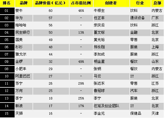 中新网6月19日电(记者 李静)胡润2006民营品牌榜今天揭晓,蒙牛、华为和娃哈哈位列三甲。而民生银行、国美、杉杉、金锣和阿里巴巴的品牌价值分别居金融、零售、服装和IT类的第一位。