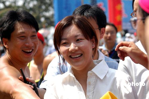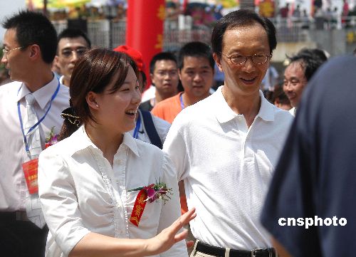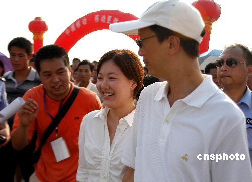6月18日,为期三天的“金银湖高尔夫”2006年武汉国际抢渡长江挑战赛暨第35届横渡长江活动落下帷幕。前奥运跳台跳水冠军湖北藉运动员伏明霞和夫君前香港财政司司长梁锦松专程从香港来到武汉,为本届渡江文化、赛事活动助威,受到武汉市民的热情欢迎。中新社发 楚天行 摄