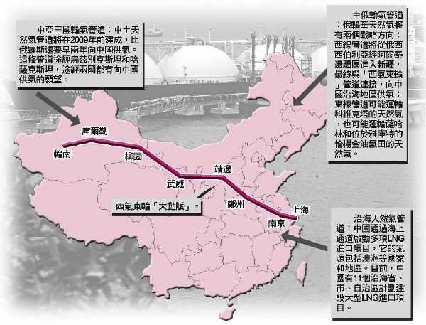 除了来自俄罗斯的两条天然气管线外,还有拟建中的中亚三国天然气管线。潘家华说,2009年以后,土库曼斯坦每年输往中国的300亿立方米的天然气也将是中国的一个重要来源。