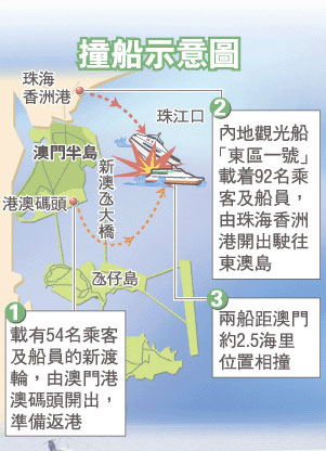 相撞的两船,分别是由澳门开出的85号新渡轮,当时船上有乘客42人、船员12人﹔以及由珠海香洲港开往大屿山西南面东澳岛的“东区一号”观光船,船上有86名乘客、6名船员。新渡轮昨早10时许自外港码头开出约15分钟,在澳门近岸约2.5海里浮标的九洲水道附近,疑收掣不及,右边船头撞及“东区一号”船尾,两船相撞后立刻停航,并通知澳门警方。