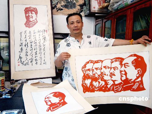 6月21日,安徽淮北矿业集团公司矿工陈国斌展示毛泽东等伟人剪纸艺术作品。为庆祝建党85周年,陈国斌用时10个月,以毛泽东、列宁、斯大林等伟人各个时期的音容笑貌、工作场景为创作源泉,经过数次描撰、涂绘等艺术创作,最终制作出毛泽东生平全身工作像剪纸20幅、写意肖像30幅和其他伟人肖像35幅共85幅剪纸作品。参加“全国向建党85周年系列艺术联展”后,将全部无偿捐献。中新社发 陈帮干 摄