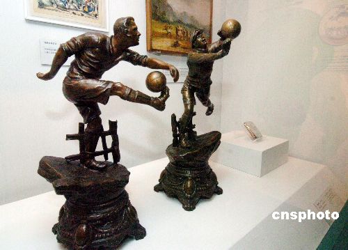 香港康乐及文化事务署与英国国际足球博物馆联合举办的大型“足球”展览﹐21日正式对市民开放参观。展览按“足球的起源”﹑“足球总会﹑协会式足球的普及和首个足球联赛”﹑“风靡各地的足球运动”﹑“国际足球协会”﹑“世界杯”﹑“古今足球名将”﹑“欧洲及英国足球”﹑“女子足球”和“香港足球”九个部分﹐通过实物展品﹑珍贵图片和现代视听等形式﹐全方位展示“足球”。中新社发 宋吉河 摄