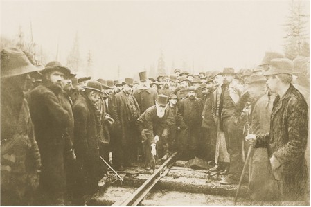 1885年11月7日,在加拿大西海岸的老鹰山口(Eagle Pass)附近的克莱拉奇(Craigellachie)聚集了一大片兴高采烈的人。一名身穿礼服、头戴大礼帽的绅士在大家的欢呼声中,拿起铁锤,将加拿大太平洋铁路修筑工程中的最后一颗道钉敲进铁轨。从此,横跨加拿大的铁路大动脉将大西洋岸边与太平洋之滨连通。