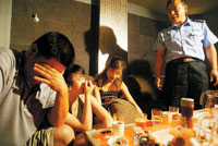 昨晚10时30分许,一路民警冲入东四一家名为北京欢歌文化娱乐有限公司歌厅的包房,十余名衣着暴露的女子捂住了脸,随即在这家歌厅里,警方检查出40余名涉嫌有偿陪侍的女子。 (韦让)