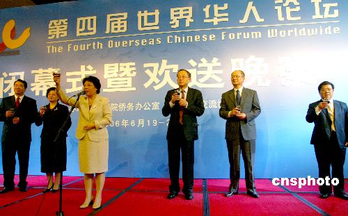 六月二十一日晚,第四届世界华人论坛闭幕式暨欢送晚宴在北京举行。论坛期间,与会代表从不同的视角深入探讨了中国民营企业在实施“走出去”战略中面临的机遇和挑战,研析了海外华商在中国民营企业“走出去”中的角色和作用,交流了中国民营企业“走出去”的成功经验和失败教训。中新社发 张勤 摄