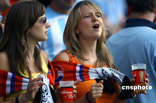 北京时间六月二十二日(德国当地时间二十一日),世界杯C组末轮两场场比赛同时开球,在德国法兰克福商业银行球场,阿根廷最终零比零战平荷兰,凭借净胜球优势夺得小组头名。图为漂亮的荷兰女球迷在看台上为荷兰队呐喊助威。中新社发 盛佳鹏 摄