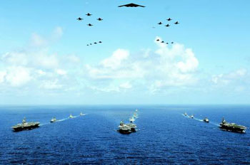 资料图:亚伯拉罕·林肯号、小鹰号和罗纳德·里根号三艘美国海军航空母舰6月18日排好队型,在关岛附近的太平洋海上航行
