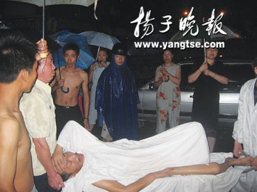 报道说,精瘦的老汉身上仅盖一层白色床单,躺在一张铝合金担架上,双眼紧闭。