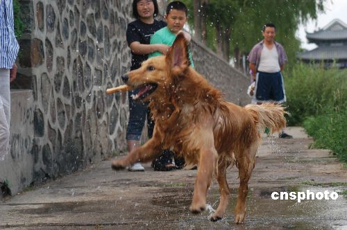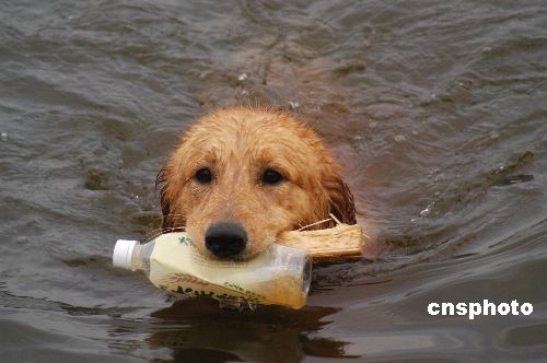 6月18日,在沈阳浑河北岸,一只名叫“金豆”的宠物狗在水中畅游,见到水中漂浮的塑料瓶、木块等垃圾便会用嘴叼住送到岸边的主人身旁,随后继续在自己清理干净的水域嬉戏玩耍。小狗这一有趣的动作让很多围观的市民感到好奇,据了解,这只狗只有一岁半,性格温顺,特别喜欢嬉戏游泳。现在天热,小狗每天都要在浑河里泡上几个小时,最有意思的就是“金豆”特爱干净,只要发现水面有漂浮的垃圾都会叼上岸。中新社发 孙海 摄