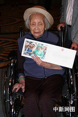 107岁的“人头税”苦主遗孀吴三英坐着轮椅来到温哥华分会场,见证百年耻辱一朝雪的历史时刻。中新社记者吕振亚摄