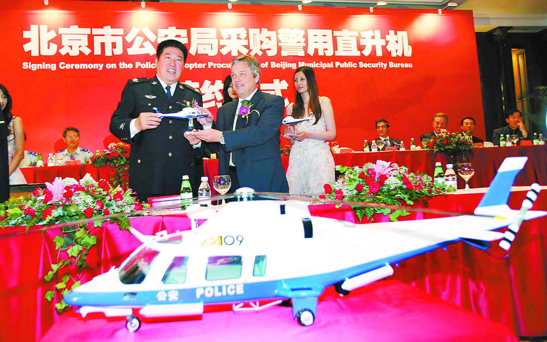 中新网6月23日电 据北京晚报报道,明年4月,北京市警方将开始装备第一架警用直升机。至明年10月,总共将有4架直升机交付北京警方。22日下午,北京市公安局与直升机生产商意大利阿古斯特威斯特兰公司和江西昌河阿古斯特直升机有限公司正式签约,采购AWl39型直升机一架、CA109型直升机两架。除采购的三架飞机外,厂商还将向北京警方赠送一架。