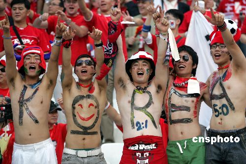 德国汉诺威当地时间六月二十三日(北京时间六月二十四日凌晨),世界杯小组赛F组瑞士对韩国的比赛在汉诺威世界杯足球场进行。瑞士队凭借两个进球二比零战胜韩国队,终结了韩国的世界杯之旅。图为比赛开场前韩国球迷在看台上赤裸上身为韩国队加油。中新社发 盛佳鹏 摄
