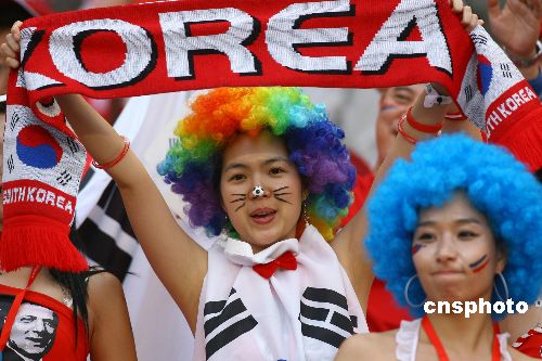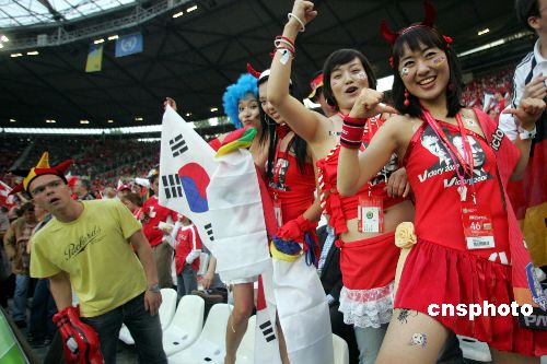 德国汉诺威当地时间六月二十三日(北京时间六月二十四日凌晨),世界杯小组赛F组瑞士对韩国的比赛在汉诺威世界杯足球场进行。瑞士队凭借两个进球二比零战胜韩国队,终结了韩国的世界杯之旅,韩国最终排名小组第三出局,亚洲4支代表队全军覆没(澳大利亚本届仍代表大洋洲)。图为韩国美女在球场为韩国队助威。中新社发 盛佳鹏 摄