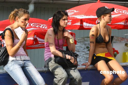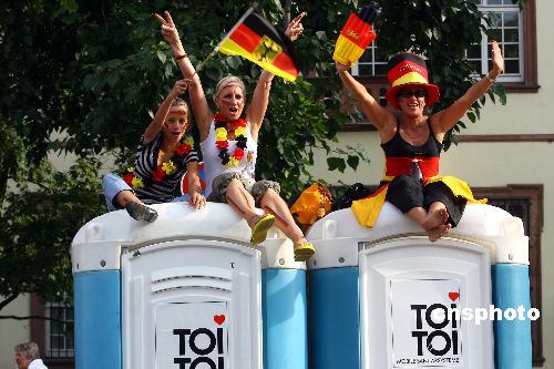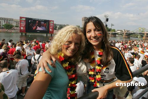德国法兰克福当地时间六月二十四日晚(北京时间六月二十五日凌晨),世界杯小组赛八分之一决赛德国对瑞典的比赛在慕尼黑世界杯足球场结束,德国队二比零战胜瑞典队进军四分之一决赛。当地政府在横穿法兰克福市区的美茵河中间架起了巨大的电视转播屏幕,数万群众聚集在美茵河两岸的球迷公园内观看比赛,为德国队加油。中新社发 盛佳鹏 摄