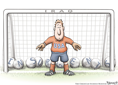 中新网6月26日电 美国《纽约时报》日前报道称,美国计划在07年年底前削弱驻伊美军兵力,但目前伊拉克各地的叛乱分子让美国疲于奔命,未来伊拉克叛乱分子的活动能否得到控制让人生疑。(漫画来源:美国基督教科学箴言报)