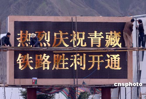 六月二十六日,青藏铁路终点站——拉萨火车站的电子屏幕前,几名工人进行最后施工。目前拉萨火车站正进行周边环境整治,工作已近尾声。青藏铁路是目前世界上海拔最高、穿越冻土里程最长的高原铁路。中新社发 韩艺冰 摄