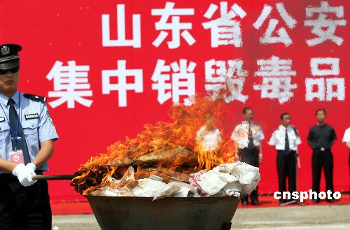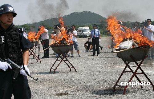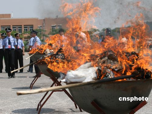6月26日,在济南销毁毒品现场,一名警察点燃毒品。当日是“国际禁毒日”,山东省公安厅在济南举行集中销毁毒品行动,现场销毁近年来查获的海洛因、鸦片等各类毒品62千克。据悉,山东警方在6月14日已在烟台集中销毁了1吨多毒品。中新社发 吕传泉 摄