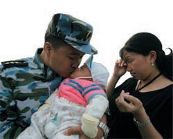 码头上满是欢送的人群,其中最引人注目的是官兵的妻子们。这是一群伟大的女性,大家都亲切地叫她们“礁嫂”。她们既有自己的工作,又要在分居的日子里独自操持家务,孝敬老人,抚育孩子,还要为守卫孤礁的丈夫担惊受怕。昨天下午,我们同几名“礁嫂”座谈,说起自己的丈夫和家庭,她们一会儿哭,一会儿笑,一会儿令人心酸,一会儿让人开怀,以致所有记者都对她们肃然起敬。今天,这些“礁嫂”一遍又一遍地抚摸整理着丈夫胸前的大红花,情不自禁地泪流满面。