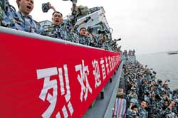 军舰解缆离港的瞬间,列队右甲板的官兵中间,突然爆发出一阵阵豪迈而又深情的呼喊:“战友再见!亲人再见!”喊声如惊雷,滚过大海,跃上云霄,震撼心扉,令人动容。
