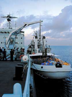 从清晨5时起,为永暑礁补给物资的工作就开始了。先是一艘拖船靠上我们的补给舰,然后补给舰上的吊车把各种物资一一吊装到拖船上,甲板上一片忙碌。