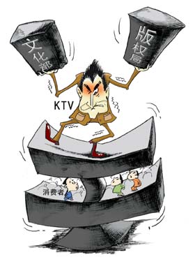 文化部即将启动“全国卡拉OK内容管理服务系统”,要通过点击率向KTV收取音乐版权费用;与此同时,国家版权局也做出决定,KTV从下个月起要按照营业面积向中国音像集体管理协会缴费;双管齐下镇在KTV头顶的两沓账本,再加上今年3月1日开始实施的“宵禁令”。
