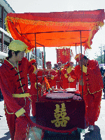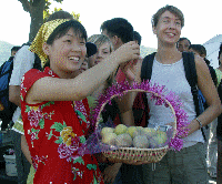 奉化水蜜桃是浙江著名的特产。在这个丰收的日子,古镇溪口的上百名艺人组成风俗方队,他们用演绎浓浓的四明文化来表达内心的喜悦。而就在此刻,剡溪两岸因这场“突如其来”的“表演”,吸引众多在此参观游览的中外客人。就在一旁,二十来位外国朋友虽然语言不通,对中国式的“娶亲”文化也不甚了解,仍好奇地频频向这支浩荡的队伍招手,他们中间的许多人在此时赶紧举起手中的相机,定格下了这精彩的瞬间。