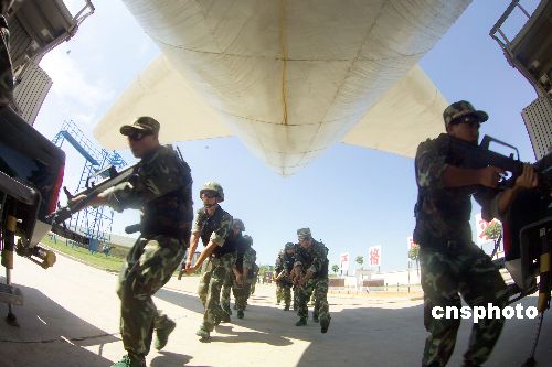 7月31日,武警湖北总队一支队某部官兵在烈日下进行处置突发事件实战演练。武警湖北总队一支队从任务和实战出发,利用酷暑天气锻炼官兵处置突发事件实战的能力,确保任务的圆满完成。中新社发 宋建春 摄
