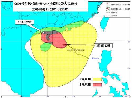 今年第6号台风“派比安”的中心今天早晨5点钟位于广东省阳江市东南方大约250公里的南海北部海面上,即北纬19.7度、东经113.2度,中心附近最大风力有12级(33米/秒)。