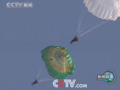 空中降落伞伞花越来越多,女飞行学员们以每秒7米的垂直下降速度飘向着陆场。30米、20米、10米……姑娘们拉下降落伞后操纵带开始减速。7米、5米、3米……大地迅速向她们扑来。经过2分30多秒时间,女飞行学员们又回到了大地的怀抱,稳稳地降落在着陆场中心的“T”字布周围。