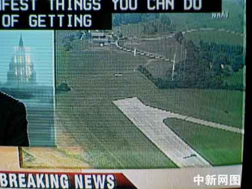 屏幕播出一架美国坠毁客机现场——跑道尽头的绿草树林一片残骸。