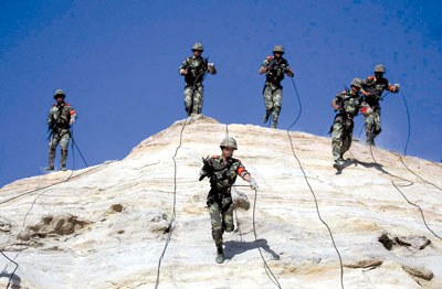 战斗从这里打开缺口,特战分队乘势而上,勇猛出击,由北向南发起猛烈攻击。正面,装甲防爆车掩护特战队员缩小包围圈,机枪、火炮猛烈打击,火力牵制;背面,特战队员顺悬崖绝壁空降而至,犹如神兵天降;断崖下,特战队员顺陡峭绝壁攀岩而上,行动自如,果断出击。一个个“恐怖分子”被活捉、击毙,顽固的“恐怖分子”头目躲进山洞,顽抗到底。