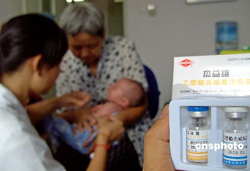 2006年8月11日,湖北宜昌疾病预防控制中心的医生在给儿童注射乙脑疫苗。据中国卫生部10日公布的全国法定报告传染病疫情数字显示,7月全国(不含港澳台地区)共报告流行性乙型脑炎发病2314例,死亡78人,与2005年同期相比,报告发病数上升43.73%,死亡数下降6.02%。卫生部指出,目前正处于乙脑高发季节,疫情高发地区应密切关注疫情的发展,采取有力的防控措施,防止疫情流行和蔓延。