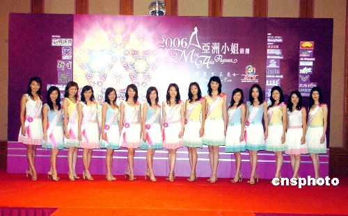 2006亚洲小姐竞选《港澳特区赛区》15位候选佳丽8月30日在香港首次亮相,她们是从四千多位港澳报名佳丽中,经过两轮面试之后选出的,年龄介乎17-24岁间,多为在校学生。这15名佳丽将会竟逐六个名额,最后代表《港澳特区赛区》出战亚洲小姐总决赛。中新社发 王丽南 摄