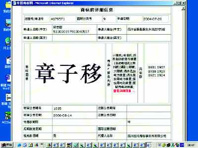 刘先生表示,这两个抢注章子怡名字的商标分别来自浙江和四川。浙江省永嘉县桥下镇一位潘姓村民在2004年4月申请了“涨紫怡”商标,注册的国际分类号为“第5类”,包括人用药、补药、中药等商品;“章子移”则是四川渠县渠北乡流江村两位村民在2004年申请的,国际分类号为“第9类”,包括一种诱杀昆虫电力装置、驱虫、驱鼠用电动装置。由于一般商标的申请期都在两年左右,因此,这两个商标目前才进入了初审公告期。