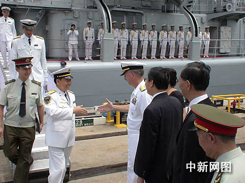 中国驻美大使周文重和驻洛杉矶总领事钟建华以及近三十个华人华侨及留学生团体的一百五十多人,欢聚军港码头迎接祖国子弟兵,约二十家中美媒体争相采访这一盛况。