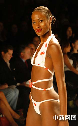 今天上午首先进行的是两场男装表演,随后久负盛名的以色列夫妻档设计师Lea Gottlieb和Armin Gottlieb旗下公司推出07年女性泳装系列,这对夫妻档以传统色调、性感的剪裁以及创意的布料混合而著称。图为模特在T台上展示他们的作品。