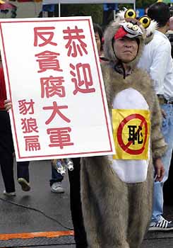 中新网9月11日电 据台湾《联合报》报道,岛内倒扁反贪腐静坐9日起如火如荼的展开,全台各地倒扁民众纷纷走上街头以自己的方式表达对陈水扁家庭弊案的抗议。他们有的身着红衣、戴着红帽,有人携家带口,有人坐着轮椅,有人从台湾中、南部专程赶来。在场民众发挥创意,把各种创意以及奇装异服都带到静坐现场,以讽刺时政。