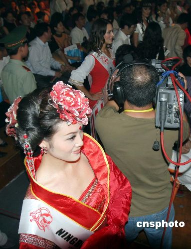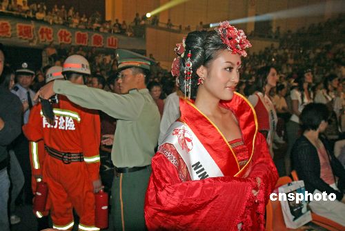9月14日,2006第十八届环球皇后竞选全球总决赛在浙江象山体育馆举行。来自泰国曼谷的佳丽NAHATAI获得此次大赛冠军,爱沙尼亚的塔林和中国宁波的佳丽分获亚、季军。由于主办方在现场观众座位编号上存在失误导致晚会开始后现场次序一片混乱,只能请求执勤武警帮忙。此时众多佳丽已经从各个看台过道亮相走秀,由于晚会现场燃放烟花且观众众多,为防火灾隐患,看台过道上站着许多手拿灭火器的消防官兵。这下便出现了武警、消防官兵和佳丽们共同“走秀”的尴尬局面。中新社发 俊影 摄
